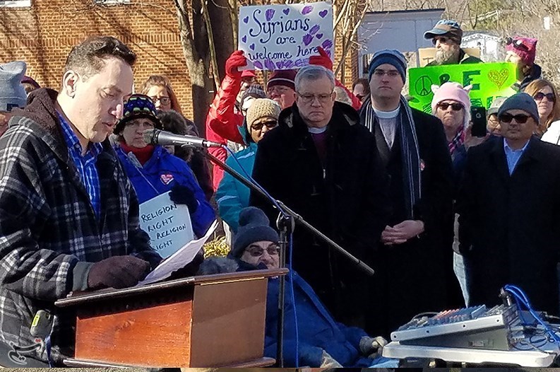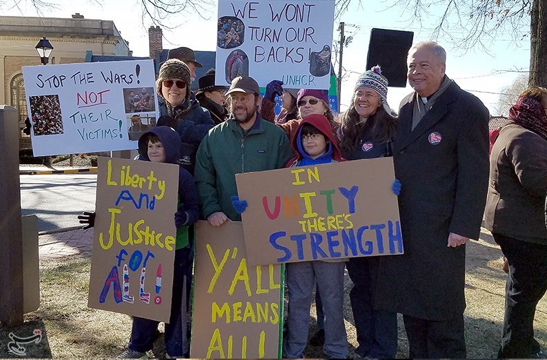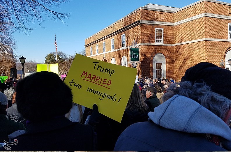 شرکتکنندگان در این تجمع، پلاکاردهایی در محکومیت تصمیمات اخیر ترامپ در دست داشتند، از جمله در یکی از این پلاکاردها، نوشته شده بود «ترامپ خود با دو مهاجر ازدواج کرده است»، تا با این شعار به ترامپ طعنه بزنند که خود مهاجر است، اما تصمیمات نژادپرستانه و خصمانهای علیه مهاجران اتخاذ کرده است. در پلاکارد دیگری نوشته شده بود:« از پناهجویان سوری استقبال میکنیم».در پلاکارد دیگریدر پاسخ به شعار ترامپ که مدعی شده بود« آمریکا را دوباره قدرتمند کنیم»، نوشته شده بود :«کاری کنیم که بار دیگر عقل و منطق حکمفرما شود». همچنین مسیحیان حاضر در این تجمع پلاکاردی در دست داشتند که تاکید میکرد حضرت مسیح(ع) همه انسانها را دوست داشت.
