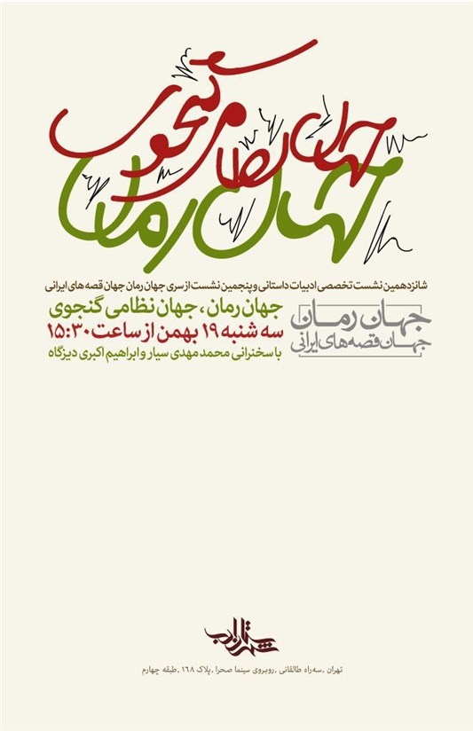 نشست «جهان رمان، جهان نظامیِ گنجوی» در عصر روز سهشنبه 19 بهمنماه از ساعت 15:30 در محل مؤسسه فرهنگی هنری شهرستان ادب واقع در خیابان شریعتی، بالاتر از سه راه طالقانی، روبروی سینما صحرا، پلاک 168 برگزار میشود.