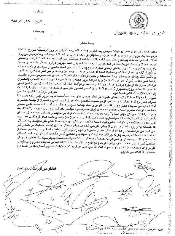 بدین وسیله ما اعضای شورای اسلامی شهر شیراز حمایت خود را از نظرات و مواضع برحق حضرت آیتالله ایمانی نماینده محترم ولی فقیه در فارس و امام جمعه معزز شیراز و حضرت آیتالله سید علی اصغردستغیب تولیت محترم آستان مقدس احمدی و محمدی (ع) اعلام میکنیم.