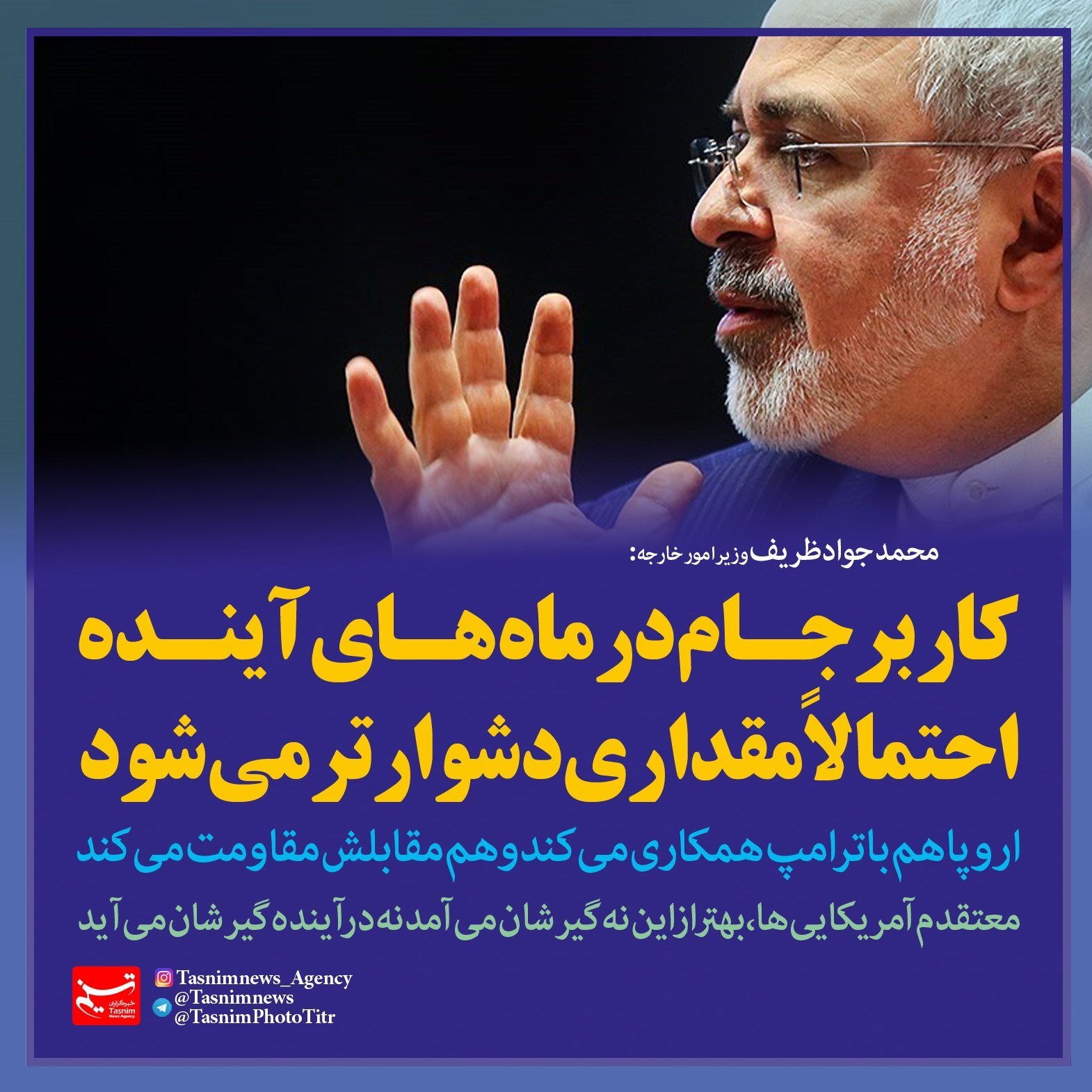 فتوتیتر/ظریف:کار برجام در ماه‌های آینده احتمالا مقداری دشوارتر می‌شود