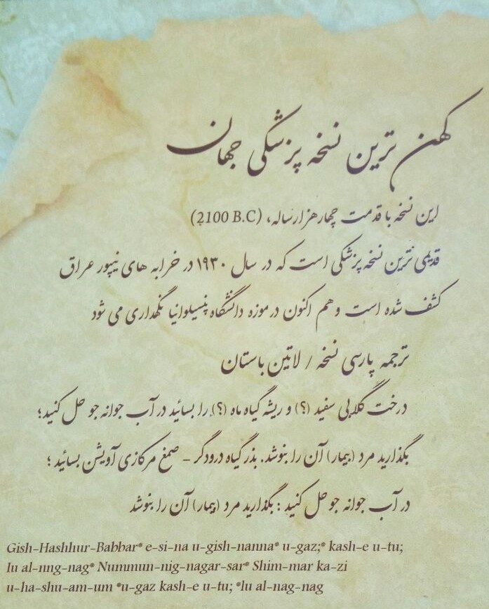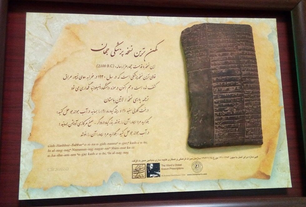 «کهنترین نسخه پزشکی جهان» با قدمت چهار هزار ساله بهعنوان قدیمیترین نسخه پزشکی در دنیا به حساب میآید که در سال 1930 در خرابههای نیپور عراق کشف شده است و هماکنون نیز در موزه دانشگاه پنسیلوانیای آمریکا نگهداری میشود.