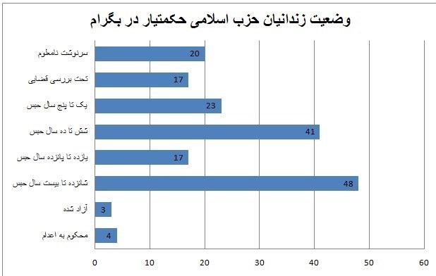 در فهرست بدست آمده توسط مرکز خبرنگاری تحقیقی پیک نام 173 نفر از حزب اسلامی حکمتیار وجود دارد و براساس اطلاعات حاصل شده، 4 نفر به اشد مجازات یعنی اعدام، 48 نفر محکوم به 16 تا 20 سال، 17 نفر از 11 تا 15 سال، 41 نفر از 6 تا 10 سال و 23 نفر دیگر به یک تا 5 سال حبس محکوم شدهاند. در این میان، سرنوشت پروندههای 20 نفر از این زندانیان تاکنون مشخص نیست و پروندههای 17 نفر دیگر در حال بررسی است.