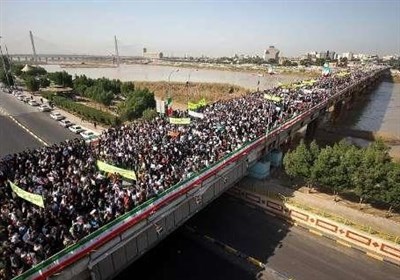 شمال تا جنوب و غرب تا شرق خوزستان یکپارچه ندای "الله اکبر" سر میدهند و طنین با صلابت صدایشان، آرامش را از روح و روان استکبار زمان آمریکا شیطان بزرگ سلب میکند. هر گامی که ایرانی و خوزستانی برمیدارد عرق شرم بر پیشانی سازمان ملل مینشاند چرا که امروز این "ما" هستیم که دفاع از حقوق بشر را به جهانیان درس میدهیم و نیز به آن عمل میکنیم؛ مردم همانند رودی روان در خیابانهای شهر جاری شدهاند و خوب میدانیم روزی این رود تمام جهان را سیراب خواهد کرد و بیداری اسلامی که هدیه امام راحل است را به جهانیان نشان خواهد داد.
