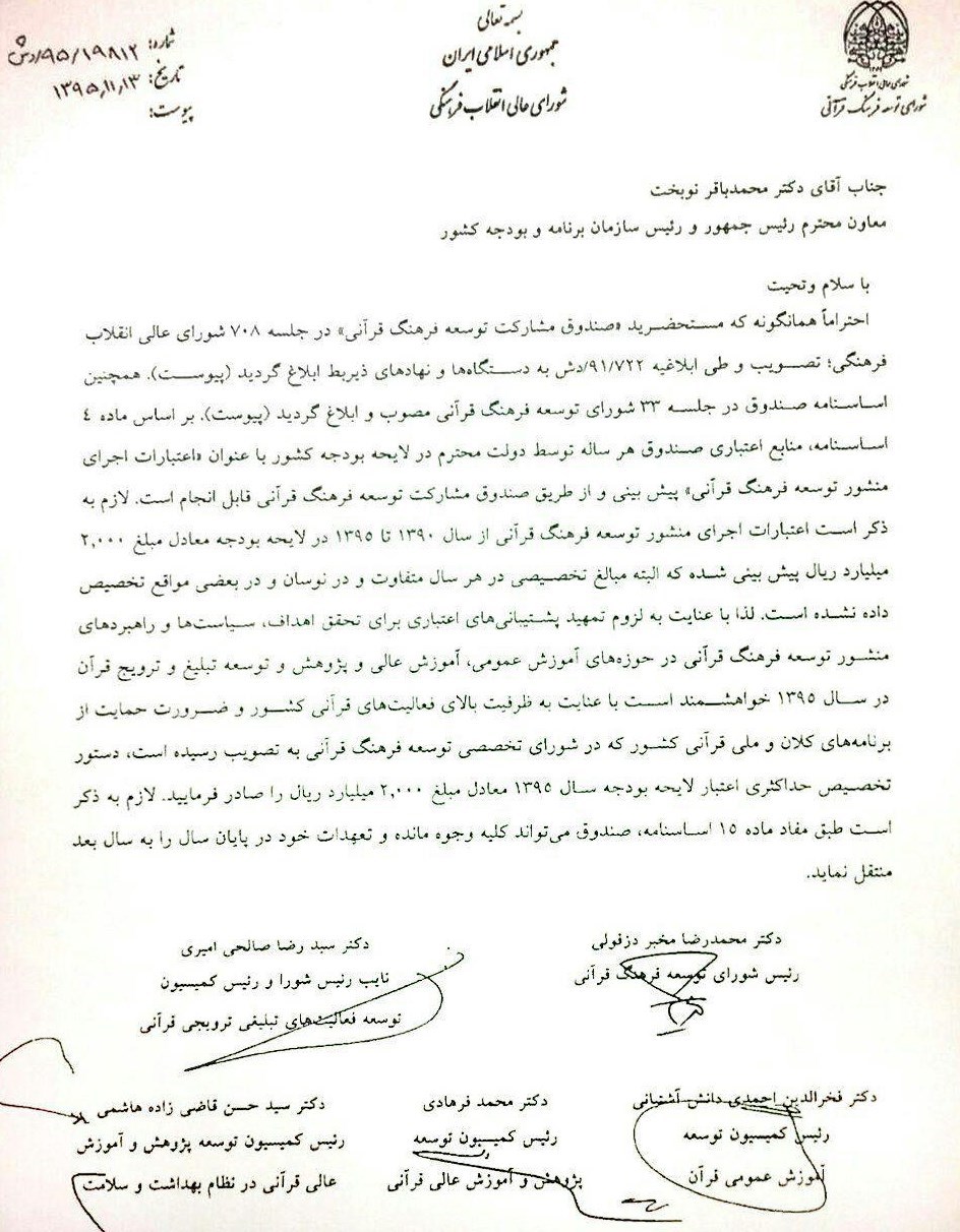 بر مبنای این نامه که در واقع توسط روسای کمیسیونهای سه گانه شورای توسعه فرهنگ قرآنی، اعم از کمیسیون توسعه آموزش عمومی قرآن، کمیسیون توسعه پژوهش و آموزش عالی قرآنی و کمیسیون توسعه فعالیتهای تبلیغی و ترویجی قرآنی امضا شده است، از دکتر نوبخت، رئیس سازمان برنامه و بودجه، تقاضا شده است، در خصوص تخصیص حداکثری اعتبار لایحه بودجه سال 95 که مبلغی معادل 2 هزار میلیارد ریال، تا پایان سال 1395، اقدام سریع و مقتضی صورت گیرد.