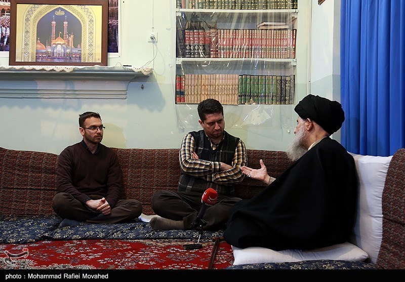 در ایام مبارک دهه فجر به بیت ایشان رفتیم. آیت الله کنار سایر شاگردان نشسته بود و بخشی از مسائل شرعی را مستقیماً از طریق تلفن به مقلدین پاسخ میداد. پس از ادای فریضه نماز بهامامت ایشان، با گرمی از ما استقبال کرد و سپس به گفتوگوی مفصل با ما نشست.