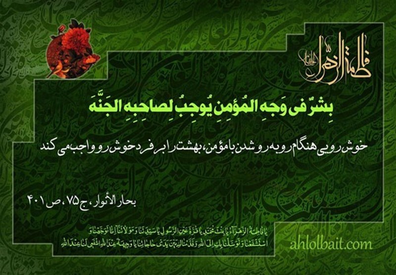 حضرت زهرا(س) در اهمیت این مسأله میفرمایند: «بشرٌ فی وَجهِ المُؤمِنِ یُوجِبُ لِصاحِبِهِ الجَنَّةَ» خوشرویی هنگام روبرو شدن با مؤمن، بهشت را بر فرد خوشرو واجب میکند. (بحارالأنوار، ج75، ص401)