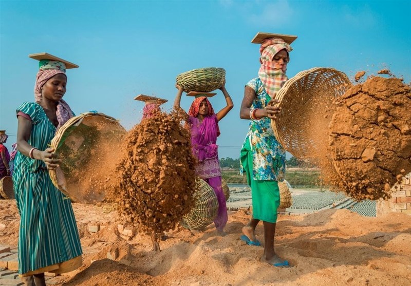 زنان هندی خاک های درون سبد هایشان را در کارگاه آجر سازی بر روی زمین می ریزند.