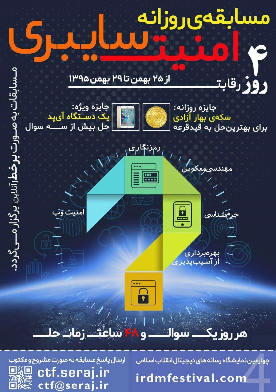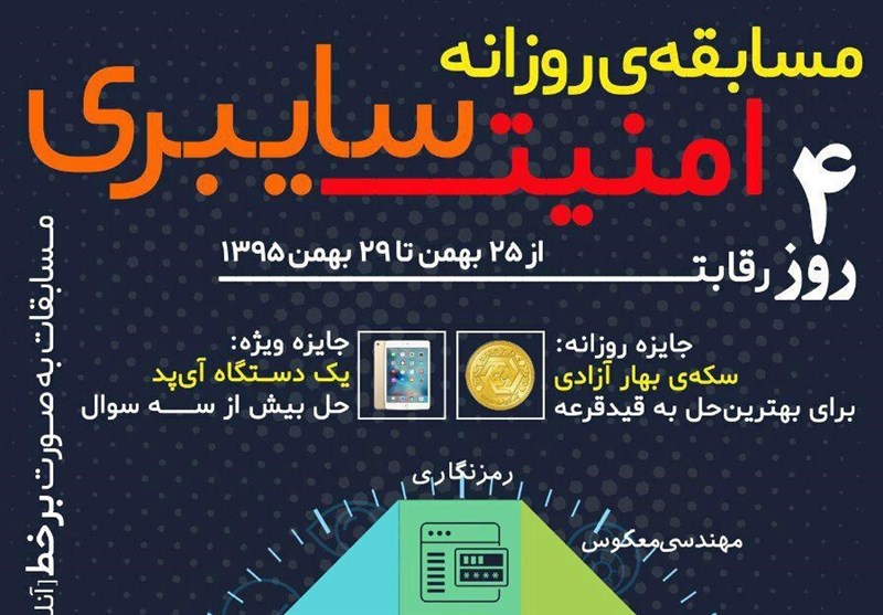 به گزارش گروه رسانه های خبرگزاری تسنیم، این مسابقه با هدف آشنایی مخاطبان با حوزه های امنیت سایبری و همچنین شناسایی استعدادهای برتر در این حوزه به صورت روزانه از دوشنبه 25 لغایت 29 بهمن ماه 1395 همزمان با برگزاری نمایشگاه رسانه های دیجیتال انقلاب اسلامی برگزار می گردد.