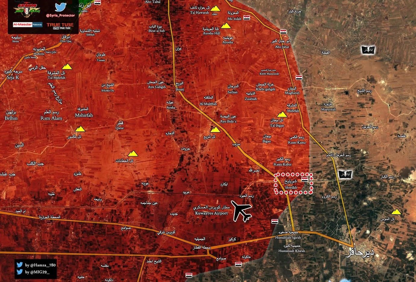 در شمال سوریه هم نیروهای ارتش در ادامه عملیات خود در حومه شرقی حلب، شهرک «شویلخ» واقع در شرق فرودگاه نظامی کویرس را پس از درگیریهای شدید با تروریستهای داعشی آزاد کردند. این شهرک از مهمترین استحکامات گروه تروریستی داعش در منطقه به سبب حفر تونلها و سنگرهای متعدد از وی داعشیها و مرتفع بودن آن نسبت به مناطق دیگر به شمار میرود، شویلخ همچنین بر شهرک حمیمیه مشرف است که به طور مستقیم بر فرودگاه نظامی کویرس مشرف است.