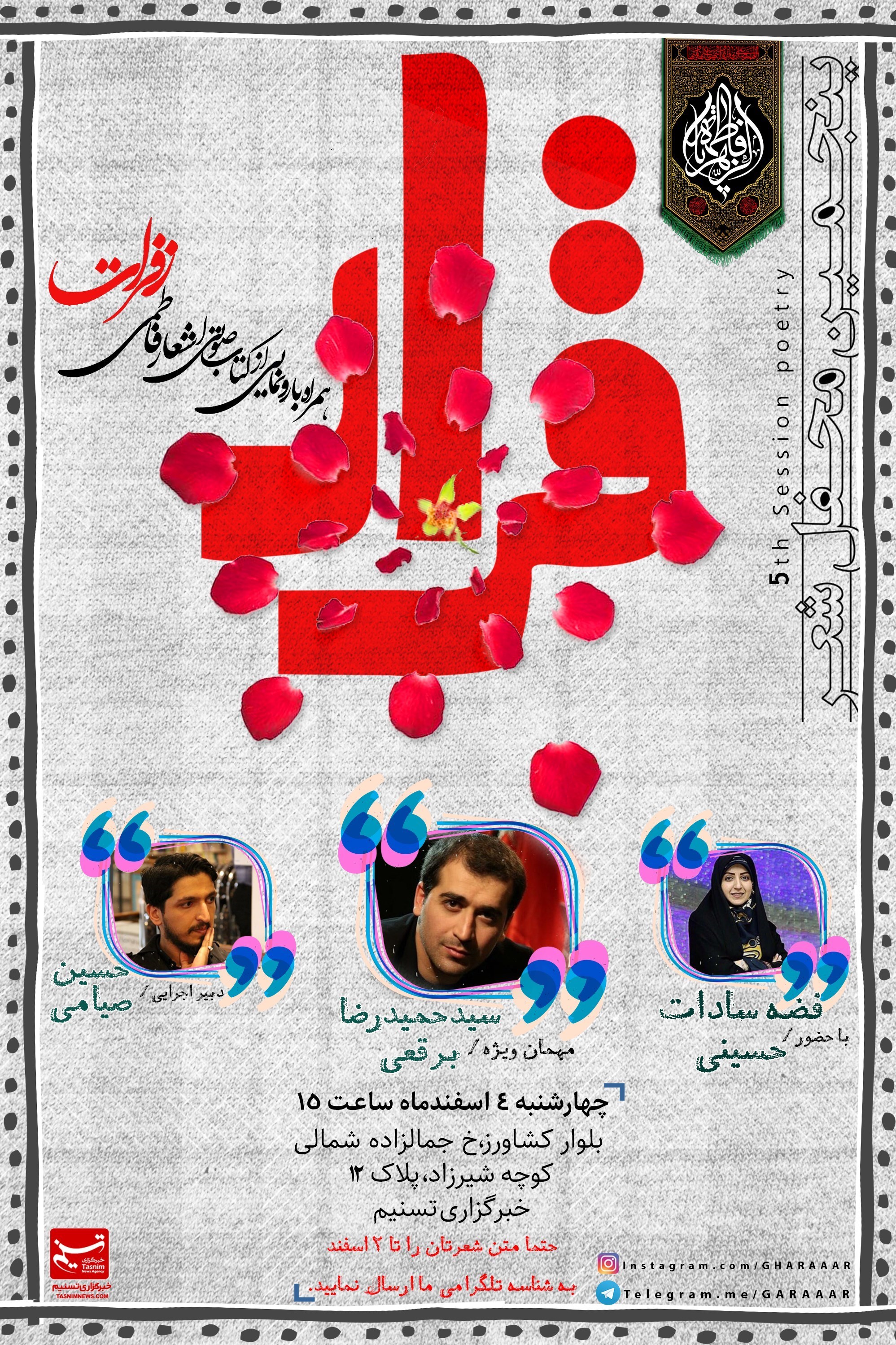 پنجمین نشست محفل شاعرانه «قرار» به همراه رونمایی از کتاب صوتی اشعار فاطمی «زفرات» سید حمیدرضا برقعی برگزار می‌شود.