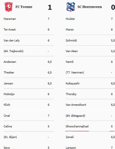 این مجله هلندی به عملکرد رضا قوچاننژاد، مهاجم تیم هیرنوین در بازی برابر توئنته نمره فنی متوسط 5 را اختصاص داد. هیرنوین در این بازی با نتیجه یک بر صفر شکست خورد و قوچاننژاد حضور 90 دقیقهای در ترکیب تیمش داشت. علیرضا جهانبخش، ملیپوش ایرانی تیم آلکمار به دلیل غیبت در بازی برابر ویلم نمرهای دریافت نکرد.