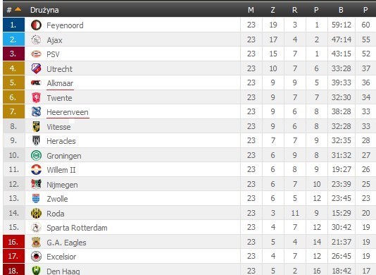 در پایان هفته بیستوسوم اردویژه هلند تیم فاینورد با 60 امتیاز صدرنشین است. آژاکس آمستردام و پیاسوی آیندهوون به ترتیب با امتیازهای 55 و 52 رتبههای دوم و سوم جدول ردهبندی را در اختیار دارند. آلکمار و هیرنوین با بهرهمندی از لژیونرهای ایرانی رتبههای پنجم و هفتم را با امتیازهای 36 و 33 به خود اختصاص دادهاند.