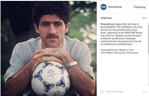 به گزارش گروه رسانه های خبرگزاری تسنیم، روز گذشته تولد کریم باقری بود و اینستاگرام رسمی فیفا تولد ستاره پرسپولیس را تبریک گفت. فیفا درباره باقری نوشت: « تولد 43 سالگی کریم باقری مبارک! این هافبک، که به شوت های قدرتمندش مشهور بود در سال 1998 با ایران در جام جهانی حضور پیدا کرد. او در مسابقات انتخابی توانسته 19 گل به ثمر برساند که بهترین گلزن در شش قاره است.»