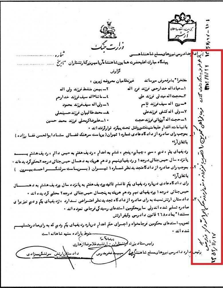 وی عنوان کرد: ساواک در دستور عمل خود آورده با توجه به تجربیات و شواهد موجود بااینکه امکان فعالیت خلاف مصالح مملکتی از جانب اقوام و دوستان افراد معدوم و محکوم وجود دارد خواهشمند است دستور فرمایید نسبت به مراقبت و کنترل خویشاوندان و دوستان افراد این گروه اقدام و در صورت مشاهده هرگونه عمل خلاف و مشکوک، مراتب را به‌موقع به این اداره کل اعلام نمایند.
