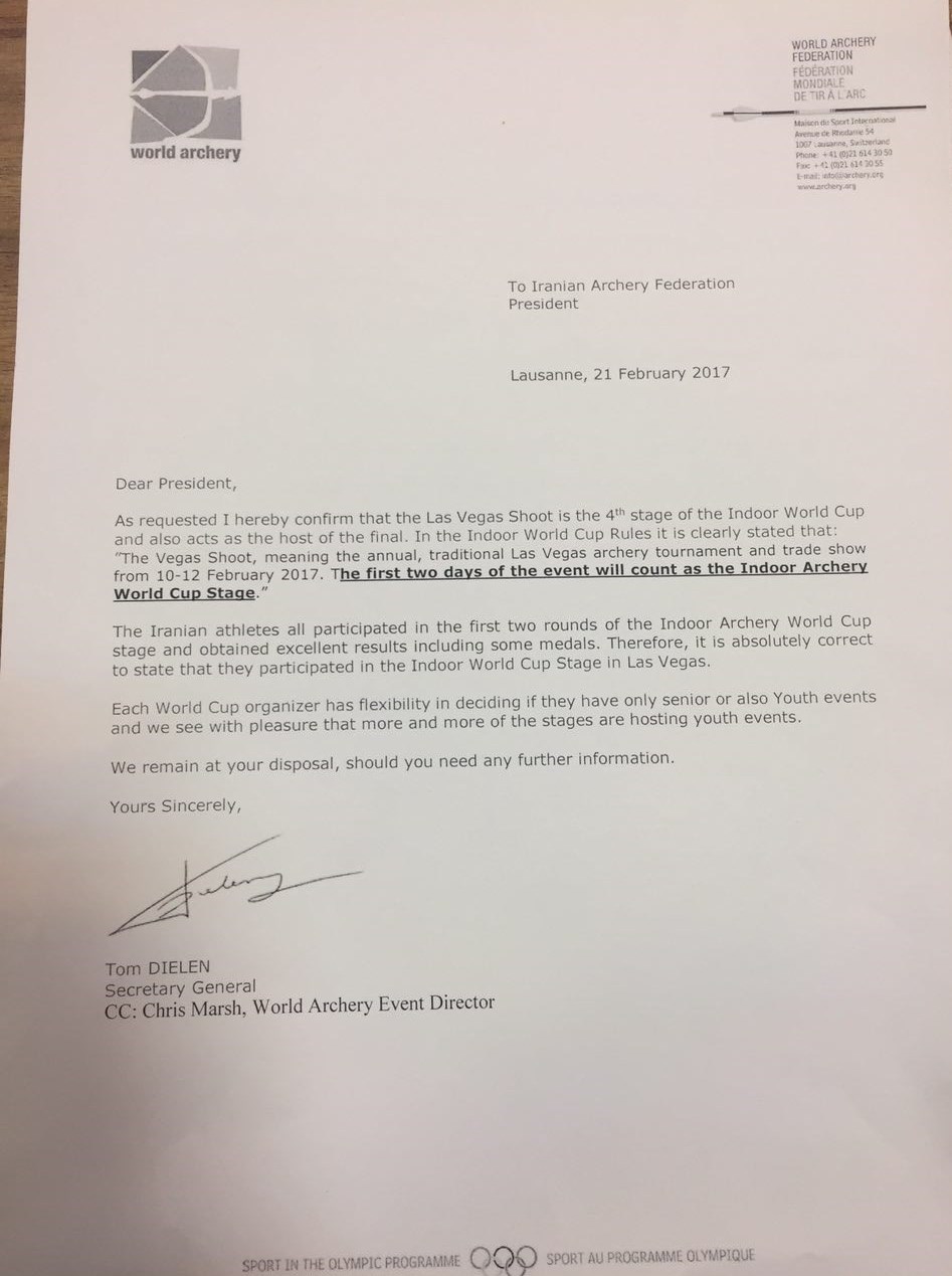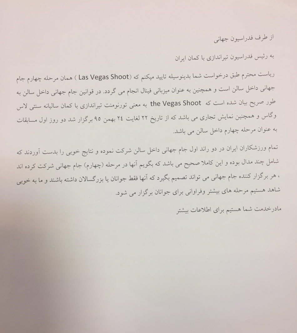 در همین خصوص فدراسیون تیراندازی با کمان توضیحاتی را ارائه کرد. این فدراسیون نامهای را به فدراسیون جهانی ارسال کرد و در آن گفت که در ایران درباره مسابقات برگزار شده به میزبانی لاسوگاس سوالاتی پرسیده میشود.