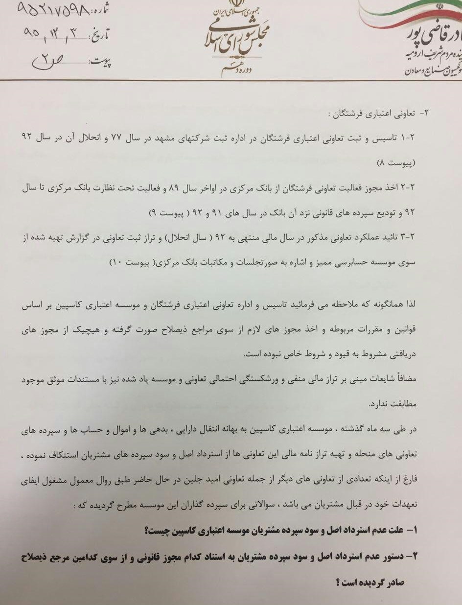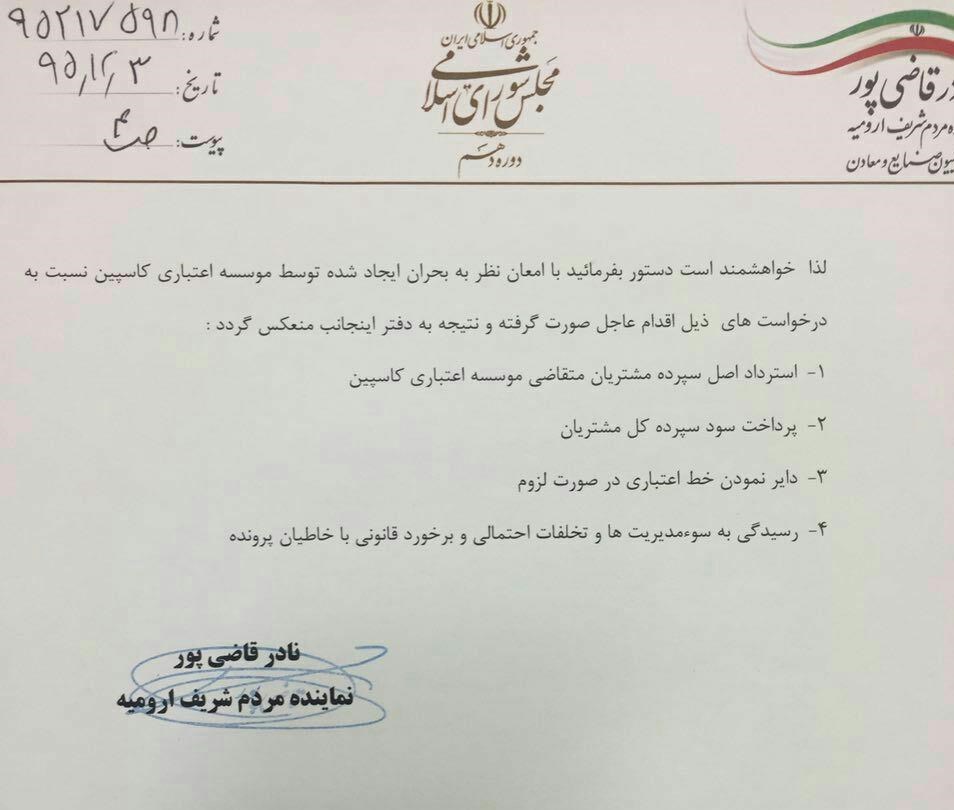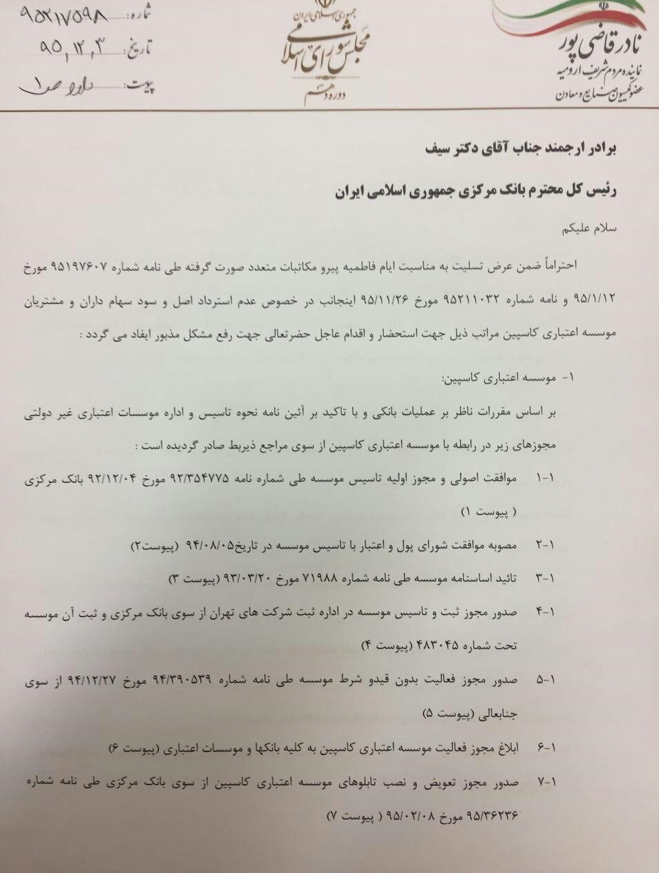 به گزارش خبرنگار اقتصادی خبرگزاری تسنیم، در نامه قاضیپور که بهعنوان نماینده علی لاریجانی رئیس مجلس شورای اسلامی برای رسیدگی به امور مؤسسات اعتباری انتخاب شده، آمده که مؤسسه اعتباری کاسپین مجوزهای لازم را دارد و باید سپرده سپردهگذاران و سود آنها پرداخت شود.