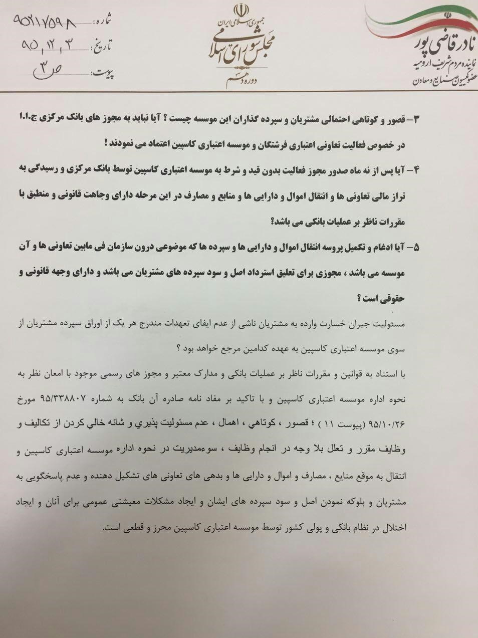 همچنین نماینده ویژه مجلس برای رسیدگی به پرونده کاسپین در نامه خود به رئیس کل بانک مرکزی تأکید کرده است: با توجه به مجوزدار بودن مؤسسه باید بانک مرکزی در این زمینه پاسخگو باشد و اقدامات عاجل را انجام دهد.