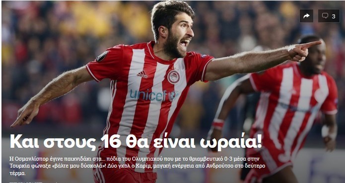 سایت ورزش یونان هم تیتر «بهشت در آنکارا» را انتخاب کرد و نوشته است: نسیم در آنکارا وزید و المپیاکوس با نتیجه 3 بر صفر پیروز شد. دو گل توسط کریم انصاری‌فرد با انرژی جادویی به ثمر رسید.