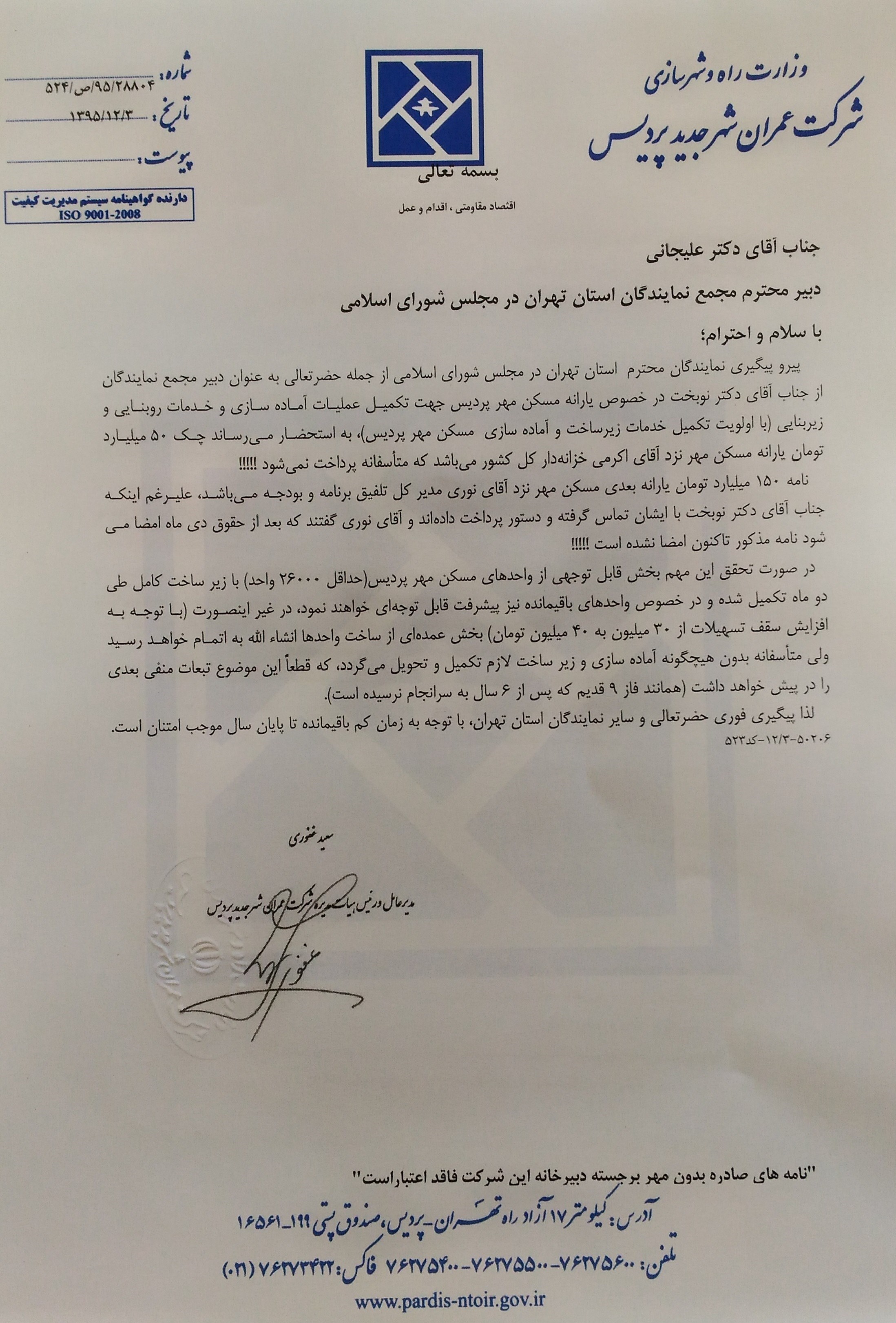 «پیرو پیگیری نمایندگان محترم استان تهران در مجلس شورای اسلامی از جمله حضرتعالی بهعنوان دبیر مجمع نمایندگان از جناب آقای دکتر نوبخت در خصوص یارانه مسکن مهر پردیس جهت تکمیل عملیات آمادهسازی و خدمات روبنایی و زیربنایی (با اولویت تکمیل خدمات زیرساخت و آمادهسازی مسکن مهر پردیس) به استحضار میرساند چک 50 میلیارد تومان یارانه مسکن مهر نزد آقای اکرمی خزانهدار کل کشور میباشد که متأسفانه پرداخت نمیشود.