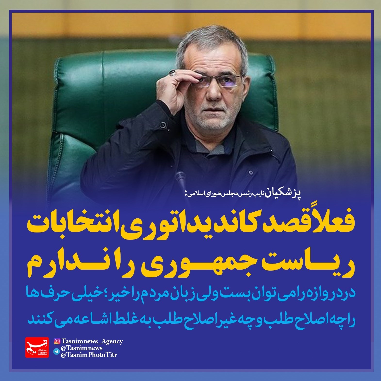 فتوتیتر/پزشکیان:فعلاً قصد‌ کاندیداتوری‌‌ انتخابات ‌ریاست ‌جمهوری‌ را ‌ندارم