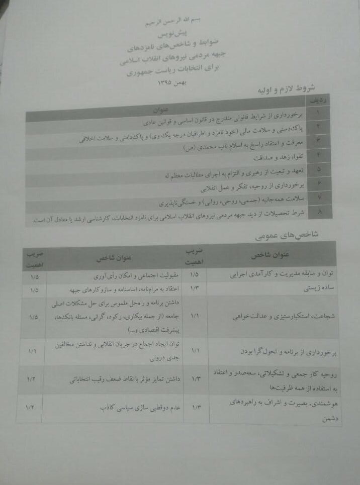 ضوابط و شاخصهای نامزدهای جبهه مردمی نیروهای انقلاب اسلای برای انتخابات ریاستجمهوری