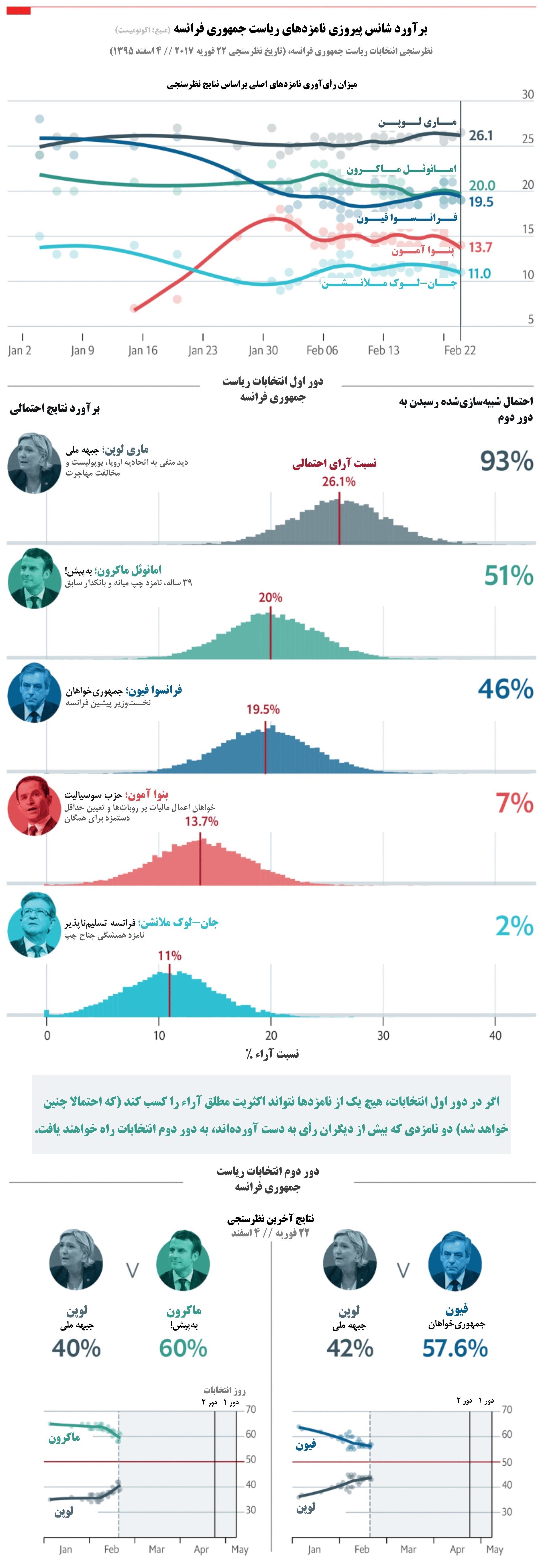 آخرین نظرسنجیها نشان میدهند که هیچ یک از نامزدها نمیتواند در دور اول انتخابات اکثریت مطلق آرا را به دست آورد، انتخابات به دور دوم کشیده خواهد شد. برآوردهای حاصل از نتایج نظرسنجیها نشان میدهند که ماری لوپن به طور قطع به دور دوم راه خواهد یافت. اما بین فیون و ماکرون برای راه یافتن به دور دوم انتخابات، رقابت سختی وجود دارد. جالب اینجاست که هریک از این دو نامزد که بتواند به دور دوم انتخابات ریاست جمهوری راه یابد، به احتمال بسیار زیاد بر ماری لوپن پیروز خواهد شد و رئیس جمهوری فرانسه میشود.