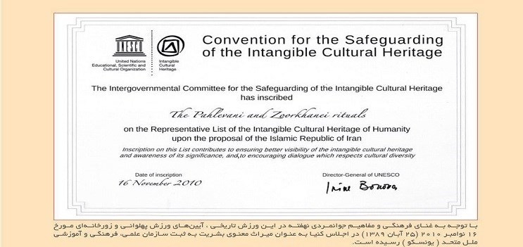 سندی دیگر از ثبت ورزشهای زورخانهای به نام ایران به شرح زیر وجود دارد که نشان میدهد که "ثبت ورزشهای زورخانهای و آیینهای پهلوانی بعنوان ورزش باستانی ایران و میراث معنوی بشریت در یونسکو " در 16 نوامبر سال 2010 به ثبت رسیده است.