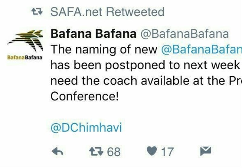 براساس پیامی که در «توئیتر» رسمی تیم ملی آفریقای جنوبی منتشر شده است، معرفی سرمربی جدید تیم ملی فوتبال این کشور به هفته بعد موکول شد.