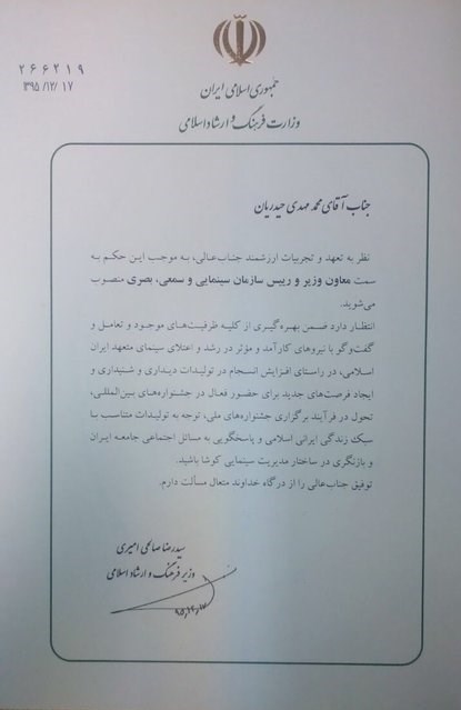 نظر به تعهد و تجربیات ارزشمند جنابعالی، بهموجب این حکم به سمت معاون وزیر و رییس سازمان سینمایی و سمعی، بصری منصوب میشوید.