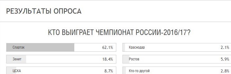 نتایج این نظرسنجی حاکی از آن است که تیم متمول اسپارتاک مسکو با آرای 62.1 درصدی شانس اول قهرمانی در لیگ برتر روسیه محسوب میشود. تیمهای زنیت سنپترزبورگ (18.4 درصد)، زسکا مسکو (8.7 درصد)، روستوف (5.9) و کراسنودار (2.1 درصد) در ردههای دوم تا پنجم شانسهای قهرمانی قرار دارند.