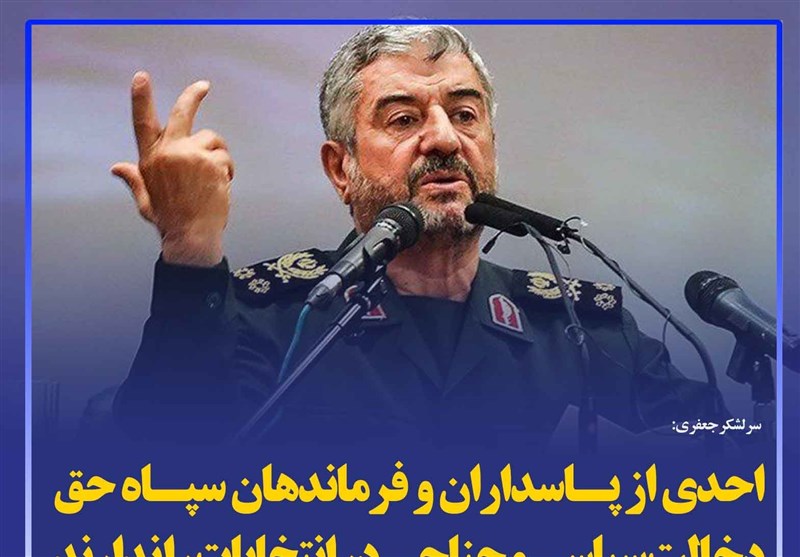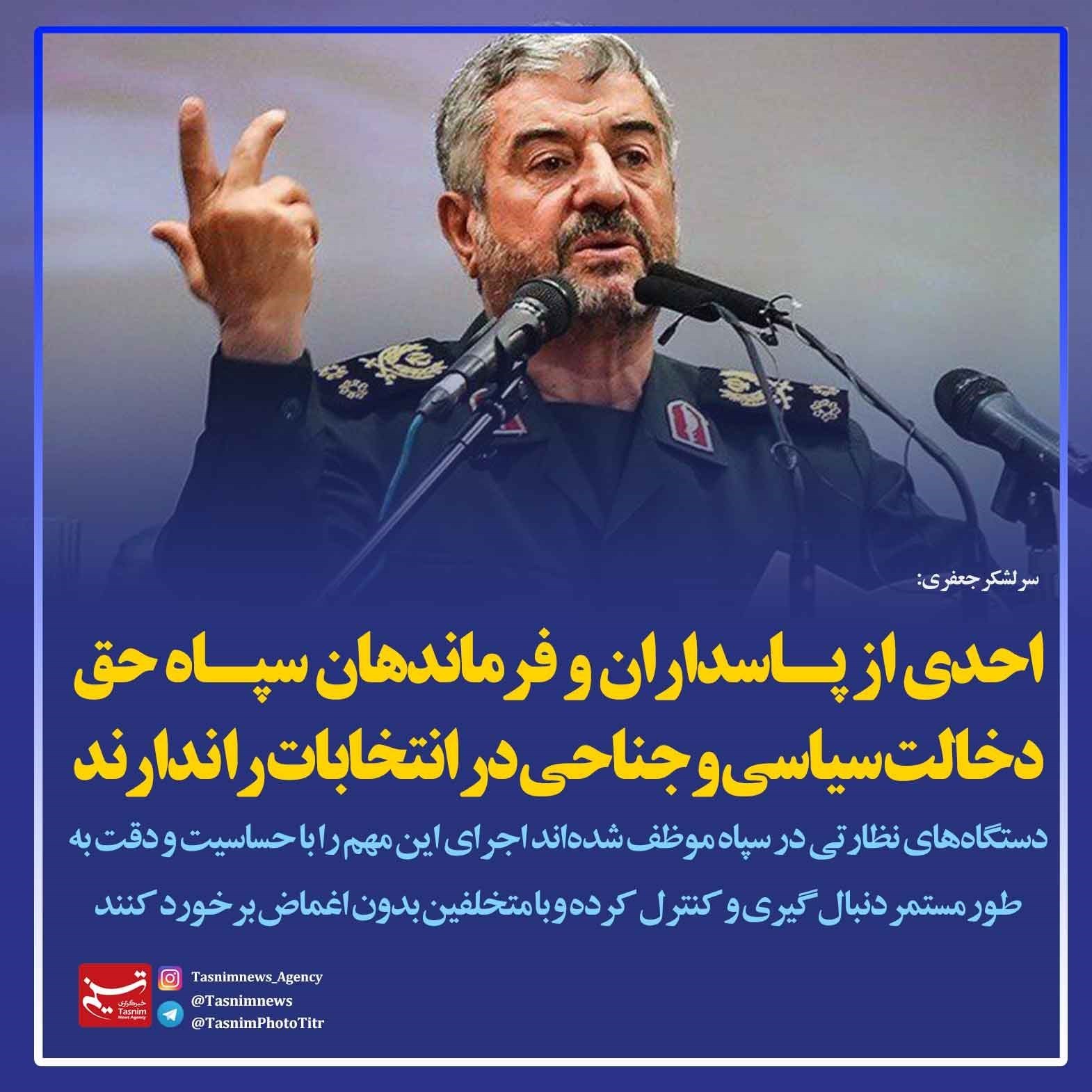 فرمانده کل سپاه تأکید کرد: احدی از پاسداران و فرماندهان سپاه همانند گذشته حق دخالت سیاسی و جناحی در انتخابات را ندارند.