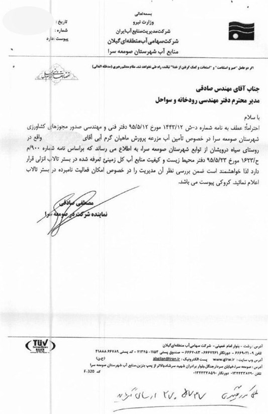 شایان ذکر است که در این رابطه نامهای از طرف شرکت آب منطقهای گیلان به شماره 2850/111 مورخ 95/7/12 خطاب به دکتر محمدپور، مدیرکل حفاظت محیط زیست استان گیلان فرستاده شده است که تاکنون هیچ واکنشی از طرف سازمان حفاظت محیط زیست و یا اداره کل حفاظت محیط زیست استان به عنوان تنها متولی حفاظت از مناطق چهارگانه، صورت نپذیرفته که جای شگفتی دارد.