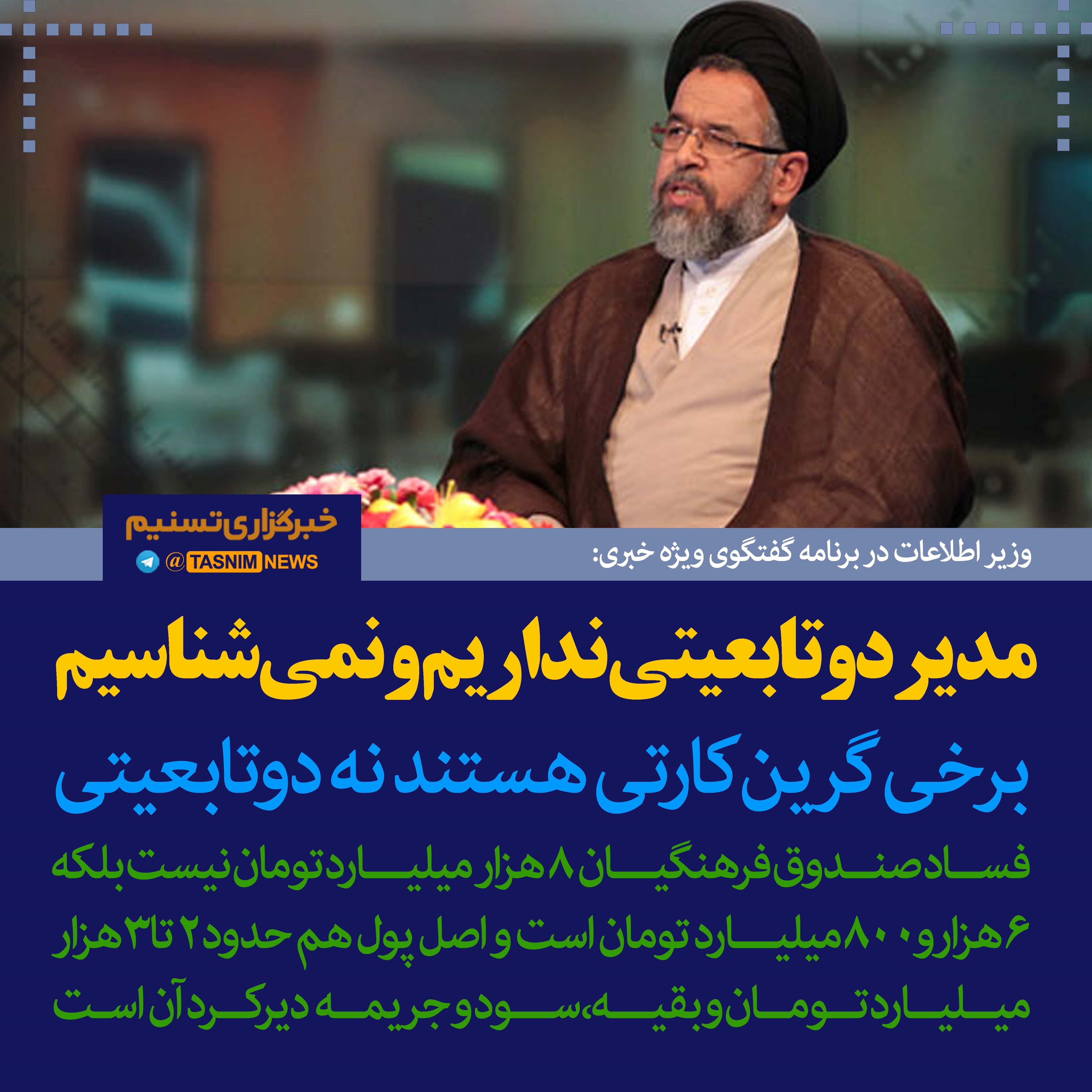 وزیر اطلاعات با بیان اینکه مدیر دوتابعیتی نداریم و نمی‌شناسیم، گفت: یکی از ائمه جمعه این موضوع را در مراسم نمازجمعه مطرح کرد "8 هزار میلیارد تومان پول فرهنگیان را خوردند" در حالی که اینگونه نبود.