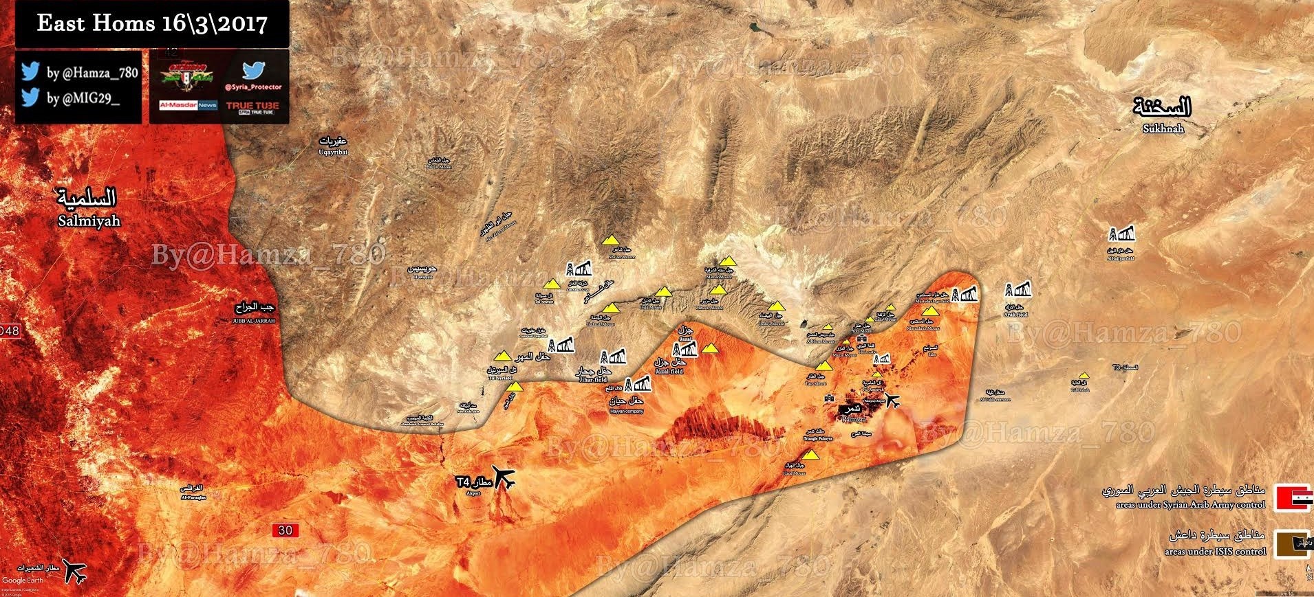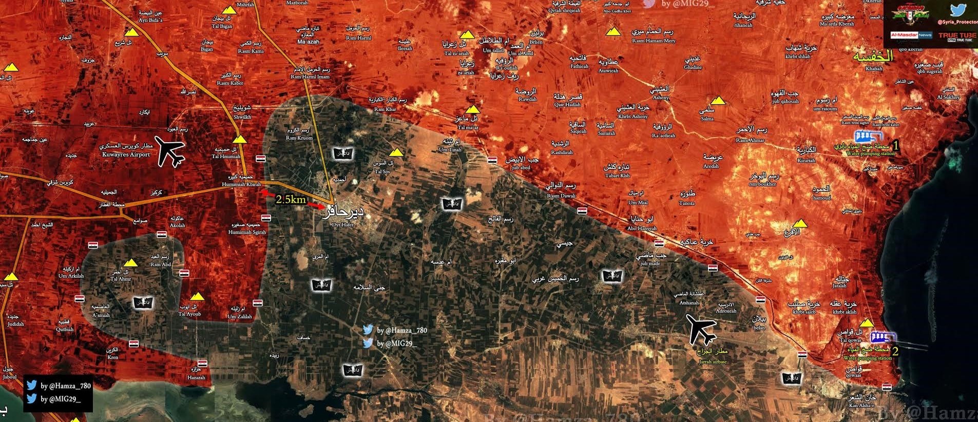 بر اساس این گزارش، نیروهای ارتش سوریه ساعتی پیش روستاهای «زبیدة و خساف» در جنوب شهر دیرحافر را در پی نبرد سنگین با تروریستهای داعشی آزاد کردند، ارتش طی ساعات اخیر هم شهرکهای «رسم العبد، تل أحمر، العاصمیة، أم زلیلة، تل ایوب و الکرین» در جنوب فرودگاه نظامی کویرس را آزاد کرده بود.
