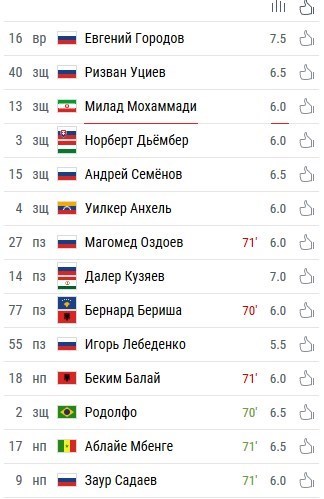 در این میان خبرگزاری ورزشی چمپیونات روسیه در ارزیابی عملکرد بازیکنان 2 تیم ترک گروژنی و زسکا مسکو با مشارکت کاربرانش به میلاد محمدی نمره متوسط 6 را اختصاص داد.