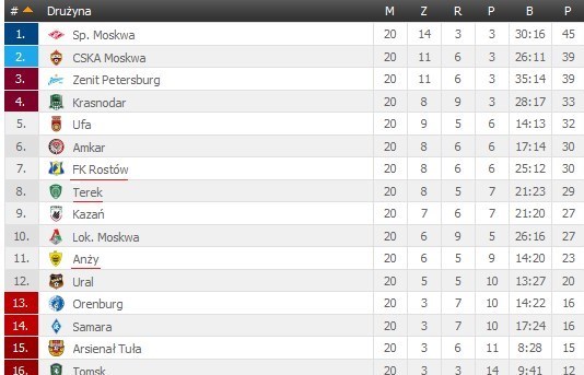 در جدول رده‌بندی لیگ برتر روسیه تیم اسپارتاک مسکو با 45امتیاز صدرنشین است و تیم‌های زسکا مسکو و زنیت سن‌پترزبورگ هم با امتیاز مشترک 39 رتبه‌های دوم و سوم را در اختیار دارند.