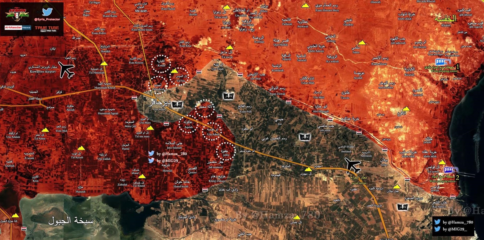 در حومه شرقی حلب، نیروهای ارتش سوریه موفق شدند شهرک استراتژیک «دیر حافر» را که در اشغال تروریستهای داعشی است، محاصره کنند، ارتش پیشتر بیشتر شهرکها و روستاهای اطراف آن از جمله «تل السوس، عاکولة،لالة محمد و احمدیة» را پس از درگیریهای شدید با داعشیها آزاد کرده بودند تا شهرک دیرحافر عملاً از نظر نظامی سقوط کرده باشد و نیروهای ارتش منتظر صدور فرمان فرماندهان برای ورود و پاکسازی آن از لوث تکفیریها هستند.