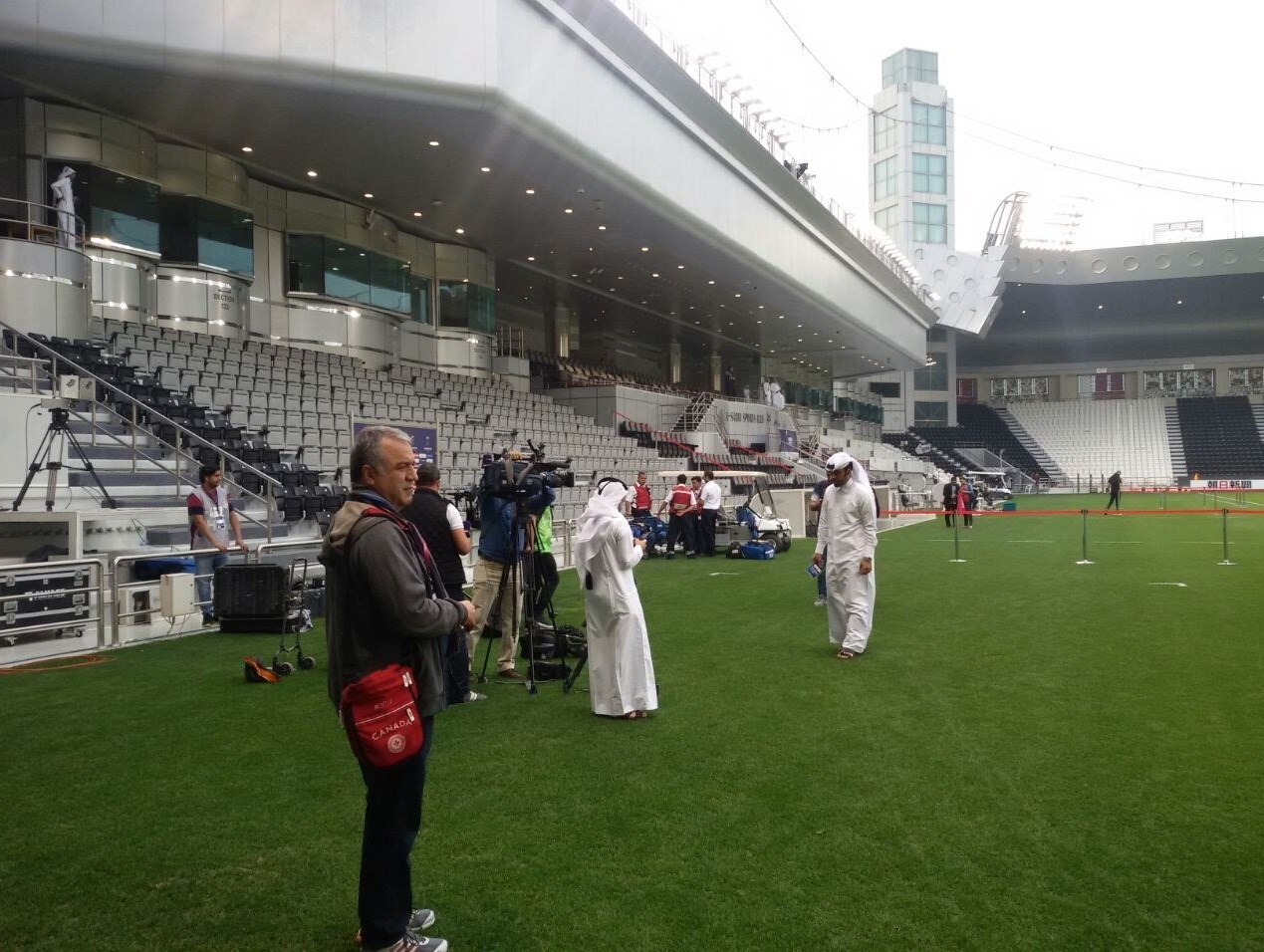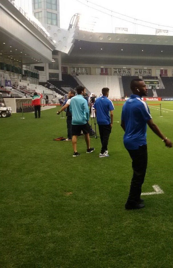 * برخی از بازیکنان قطر پس از ورود به ورزشگاه وارد زمین چمن شدند و در زمین قدم زدند.