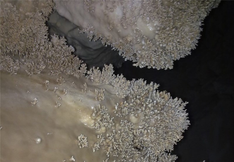 در دیوارههای غار در اثر رسوب کربنات کلسیم محلول در آب اشکال بسیار سپید و زیبایی مانند گچبریهای کاخها و منازل بهصورت گلکلمی و اجتماع بلورهای سوزنی شکل مناظر جالبتوجه و زیبایی را به وجود آورده است که از شاهکارهای آفرینش است.