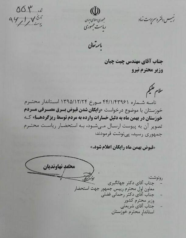 نامه شماره 43961/1/44 مورخ 24/12/1395 استاندار محترم خوزستان با موضوع درخواست رایگان شدن قبوض برق مصرفی مردم خوزستان در بهمن ماه به دلیل خسارات وارده به مردم توسط ریزگردها که تصویر آن به پیوست ارسال می شود به استحضار ریاست محترم جمهوری رسید، پی نوشت فرمودند: "قبوض بهمن ماه رایگان اعلام شود"
