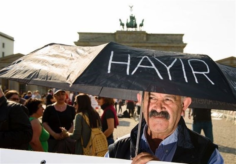 مخالفان رئیس جمهور ترکیه در تجمعی صلح آمیز در دوازه براندنبورگ برلین برای گفتن "نه" در همه پرسی اصلاح قانون اساسی ترکیه تبلیغ کردند.