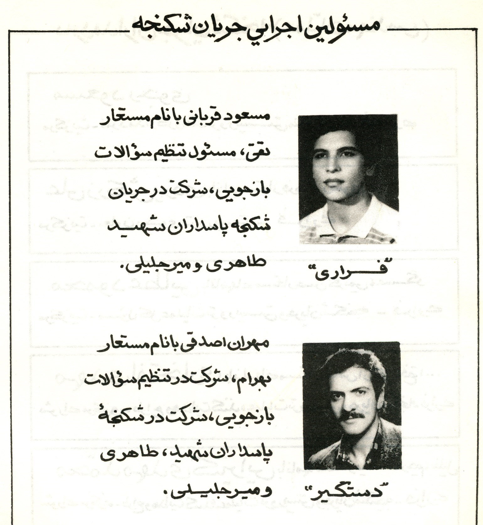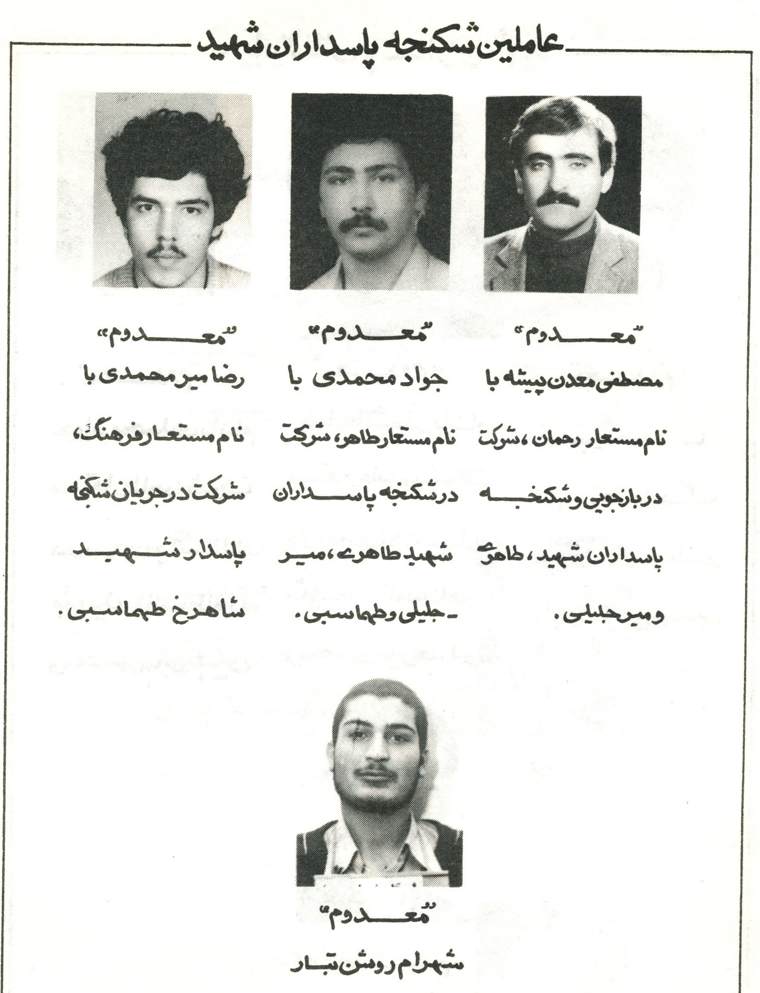 مسعود قربانی (مسئول) ــ مهران اصدقی (دستیار اصلی قربانی) ــ مصطفی معدنپیشه (مشارکت در شکنجه روستا، عفتروش، ریاحی نظری) ــ جواد محمدی (عفتروش، طاهری، میرجلیلی و طهماسبی) ــ شهرام زرینتبار (ریاحی نظری، طاهری، میرجلیلی) ــ محمد جواد بیگی (مسئول شکنجه شاهرخ طهماسبی) ــ عباسی دولتآبادی، رضا هاشملو، ناصر فراهانی، رضا میرمحمدی (دستیاران بیگی در شکنجه شاهرخ طهماسبی).