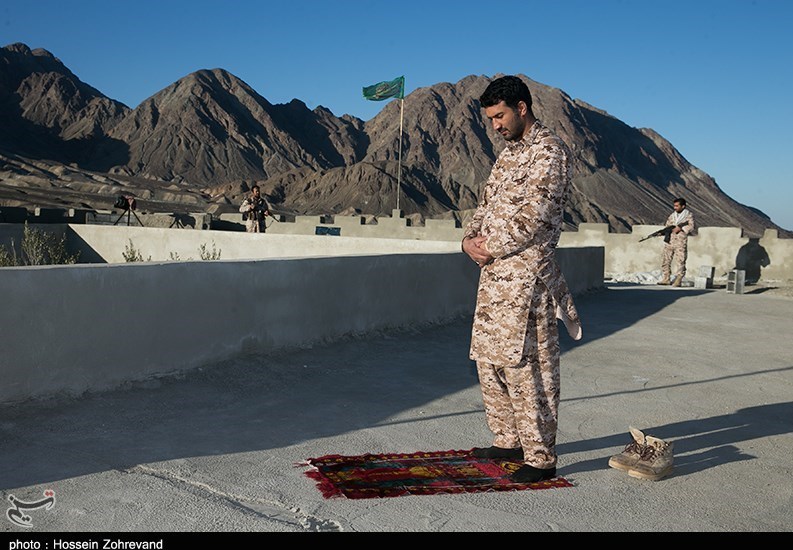 اقامه نماز توسط یکی از نیروهای اهل سنت طرح امنیت شهید شوشتری در پایگاه مرزی سپاه