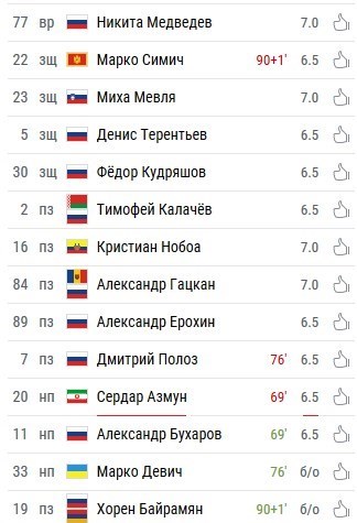 در این میان خبرگزاری ورزشی چمپیونات روسیه با مشارکت کاربرانش در ارزیابی فنی عملکرد بازیکنان 2 تیم روستوف و کراسنودار به سردار آزمون نمره خوب 6.5 اختصاص داد. نیکیتا مدوودف، کریستین نوبوآ و میخا موولیا با دریافت نمره 7 بهترین بازیکنان روستوف در این بازی خانگی بودند.