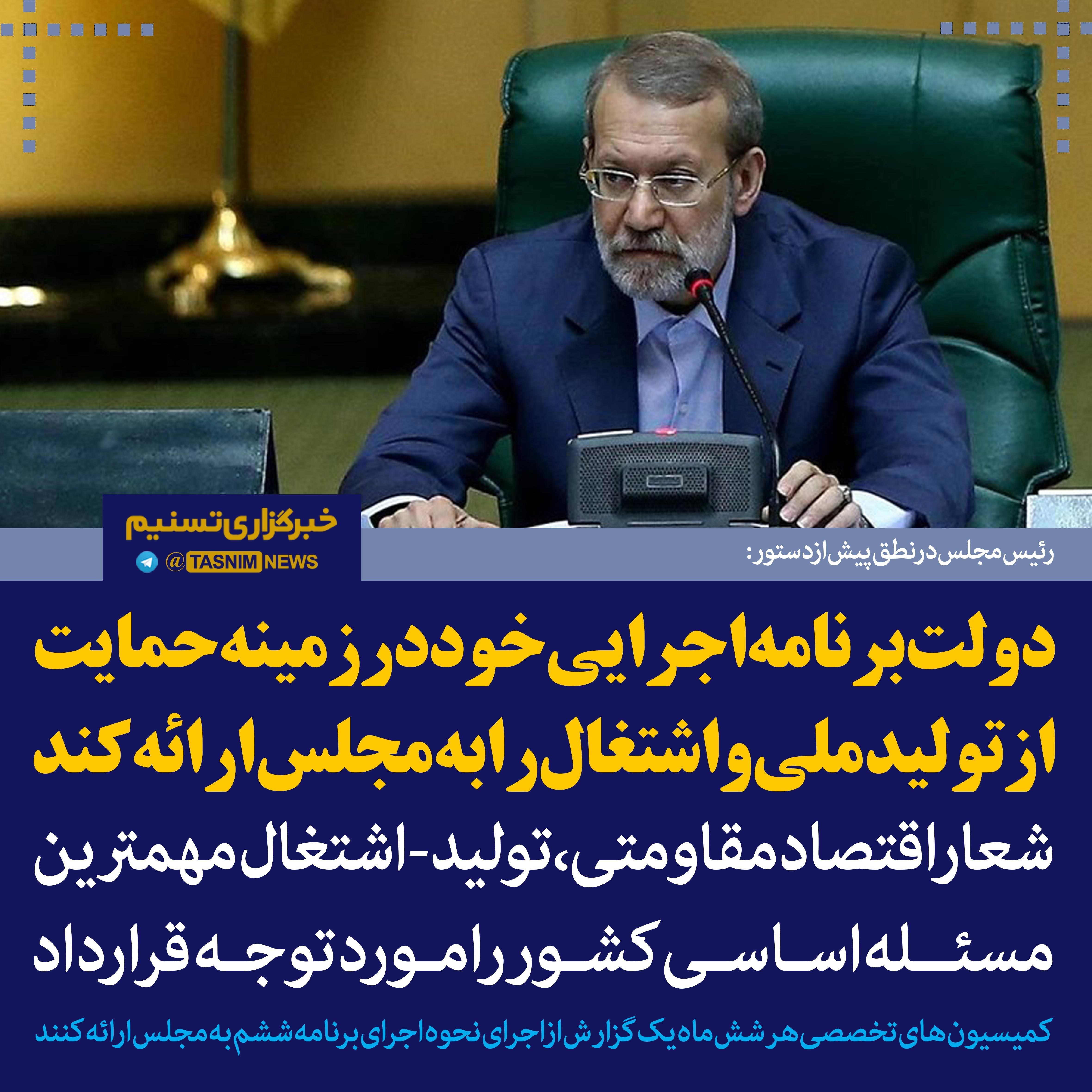 فتوتیتر/لاریجانی:دولت برنامه اجرایی خود در زمینه حمایت از تولید ملی و اشتغال را به مجلس ارائه کند