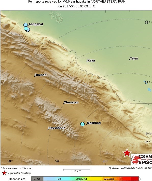 مقایسه این زلزله با زلزله ویرانگر شهر بم که در سال 82 بیش از 26 هزار نفر را به کام مرگ کشاند نشان میدهد که زلزله امروز خراسان رضوی فقط 0/5 ریشتر کمتر از زلزله بم بوده است، این در حالی است که مرکز لرزهنگاری آمریکا قدرت زلزله امروز خراسان رضوی را 6.1 ریشتر اعلام کرده است.