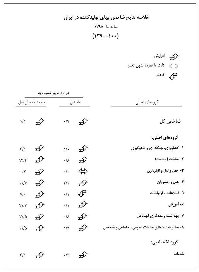 - شاخص بهای تولیدکننده در ایران در اسفند ماه 1395 به عدد 235.4 رسید که نسبت به ماه قبل 0.7 درصد افزایش داشته است.