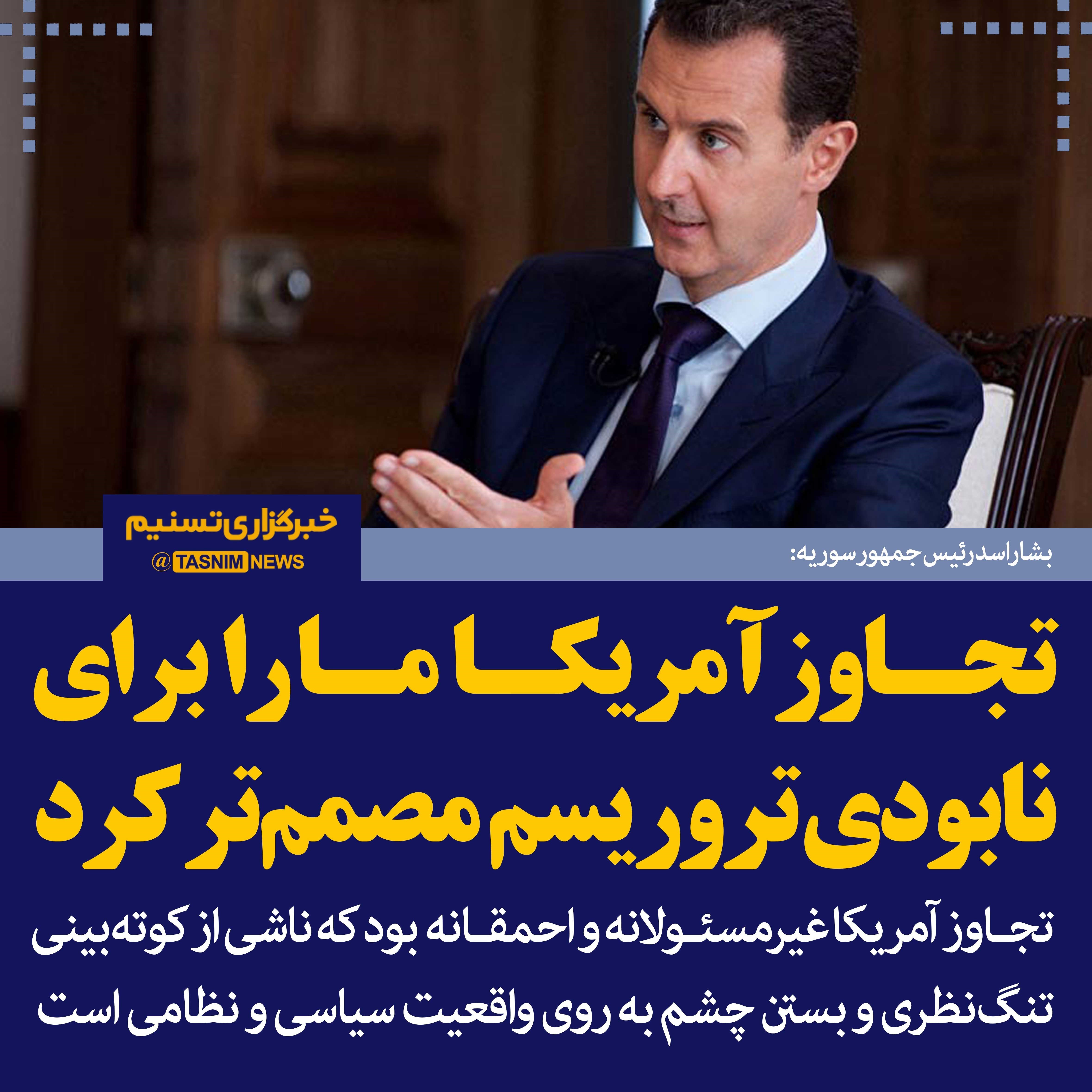 رئیس جمهور سوریه گفت: تجاوز آمریکا غیرمسئولانه و احمقانه بود که ناشی از کوته‌بینی، تنگ‌نظری و بستن چشم به روی واقعیت سیاسی و نظامی است.