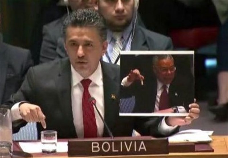 به گزارش گروه بینالملل خبرگزاری تسنیم، نماینده بولیوی روز جمعه در نشست شورای امنیت بادر دست گرفتن عکسی از وزیر خارجه آمریکا درزمان حمله به عراق گفت: «مهم است درس تاریخ را به یاد داشته باشیم: آمریکا دروغ میگوید تا جنگ را توجیه کند».