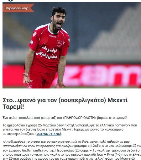 این رسانه یونانی در ادامه با اشاره به موثق و قطعی بودن خبرش نوشته است: المپیاکوس، پاناتینایکوس، پائوک و آ.ا.ک، 4 تیم بزرگ و مطرح سوپر لیگ یونان نام مهدی طارمی را در فهرست خریدهای تابستانی سال جاری میلادی قرار دادهاند. این مهاجم 25 ساله در بازی اخیر تیم ملی ایران برابر چین گل پیروزیبخش را به ثمر رساند که سبب صعود این تیم به جامجهانی 2018 روسیه خواهد شد.